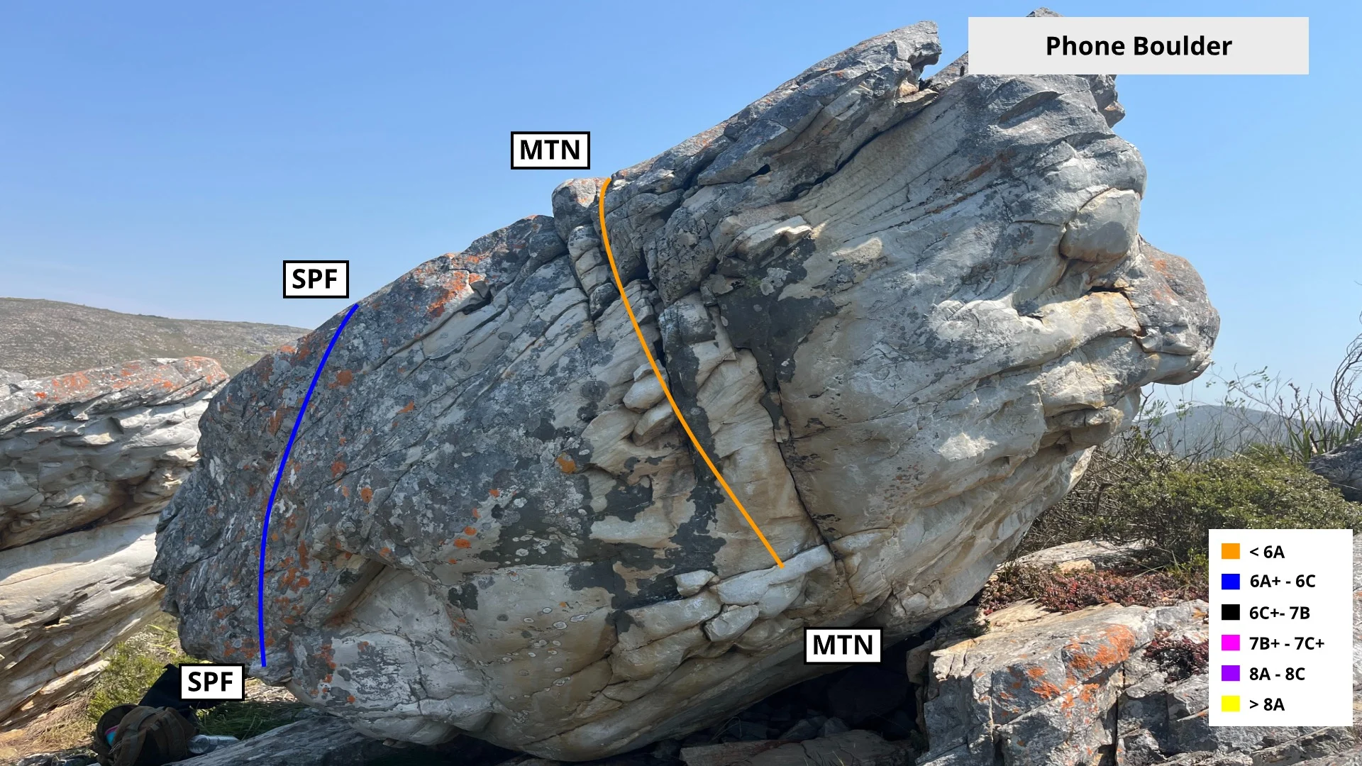 All information and TOPO's provided by Luke Cousins, Tristin O’Connell, Munro Munnik and Cameron Wesson's Kruisfontein Bouldering Guide. If you wish to climb here, please WhatsApp message Luke Cousins on 0814872485, so that he can inform the landowners. You are encouraged to log your climbs on the Vertical Life (8a.nu) website https://www.8a.nu/ so that the area can get exposure as well as to inform updates to the guide in terms of grades.