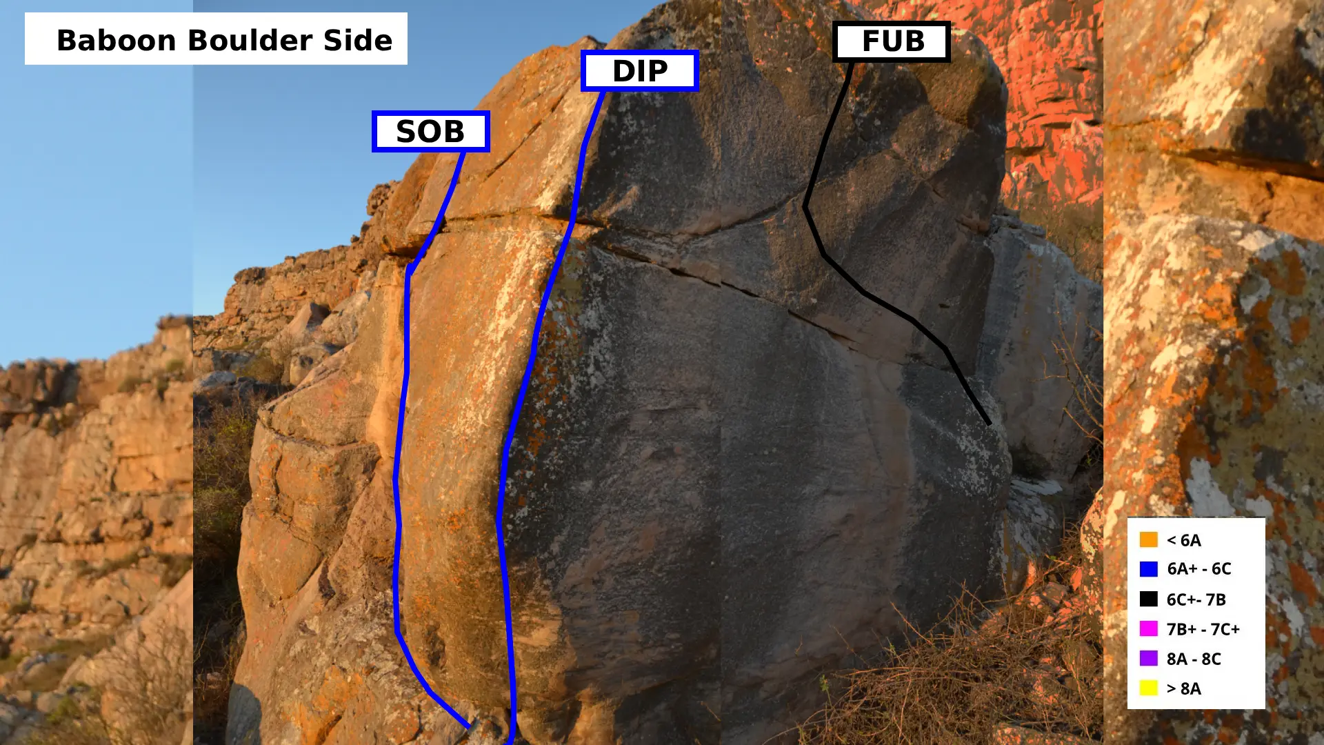 Indicates the overall style. Face climbing is steeper than slab usually on small holds and edges, often feeling delicate / insecure.